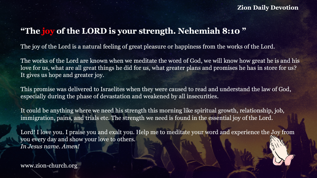 This promise was delivered to Israelite’s when they were caused to read and understand the law of God, especially during the phase of devastation and weakened by all insecurities. It could be anything where we need his strength this morning like spiritual growth, relationship, job, immigration, pains, and trials etc. The strength we need is found in the essential joy of the Lord.