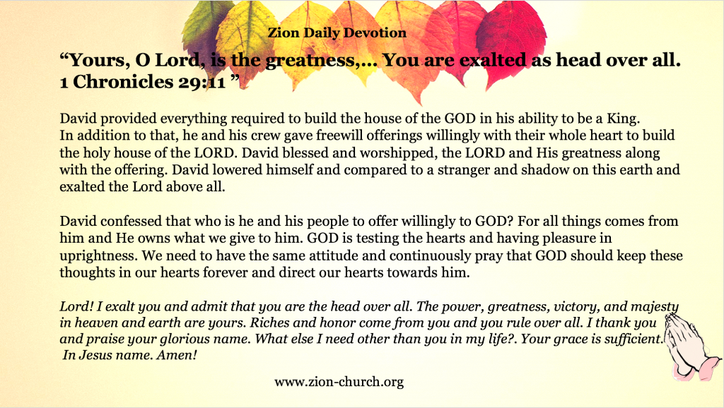 Yours, O Lord, is the greatness,… You are exalted as head over all. 1 Chronicles 29:11