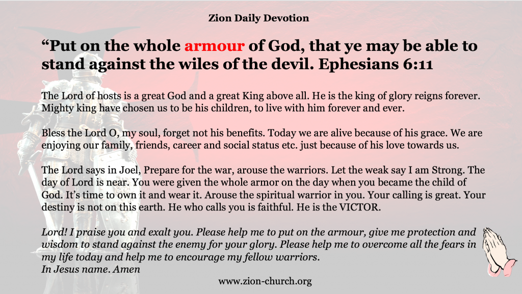 Lord! I praise you and exalt you. Please help me to put on the armour, give me protection and wisdom to stand against the enemy for your glory. Please help me to overcome all the fears in my life today and help me to encourage my fellow warriors. In Jesus name. Amen