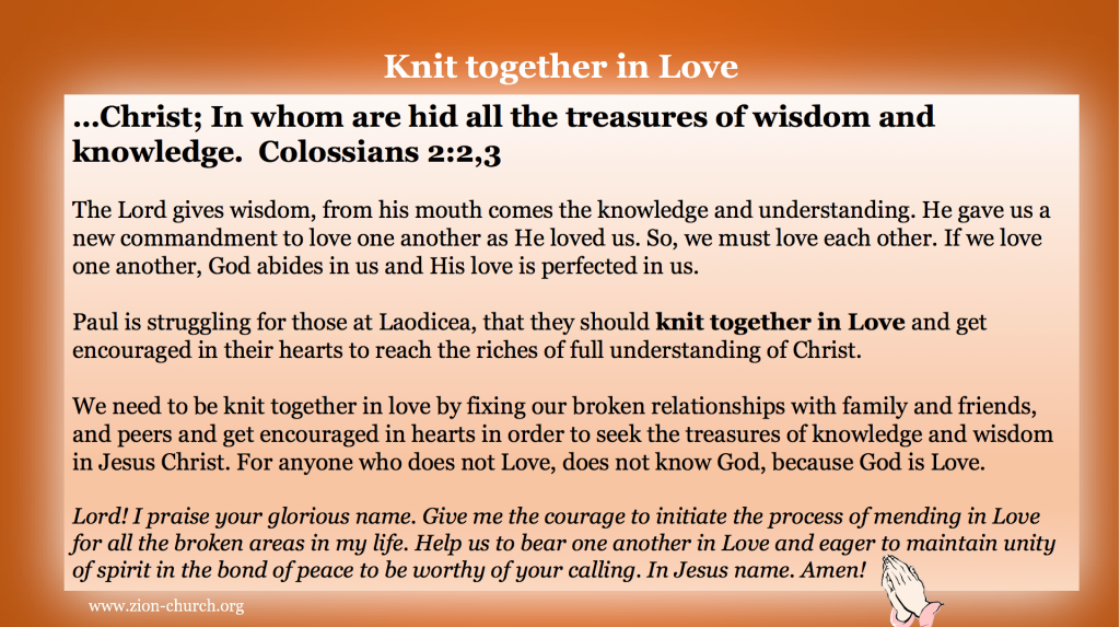 We need to be knit together in love by fixing our broken relationships with family and friends, and peers and get encouraged in hearts in order to seek the treasures of knowledge and wisdom in Jesus Christ. For anyone who does not Love, does not know God, because God is Love.